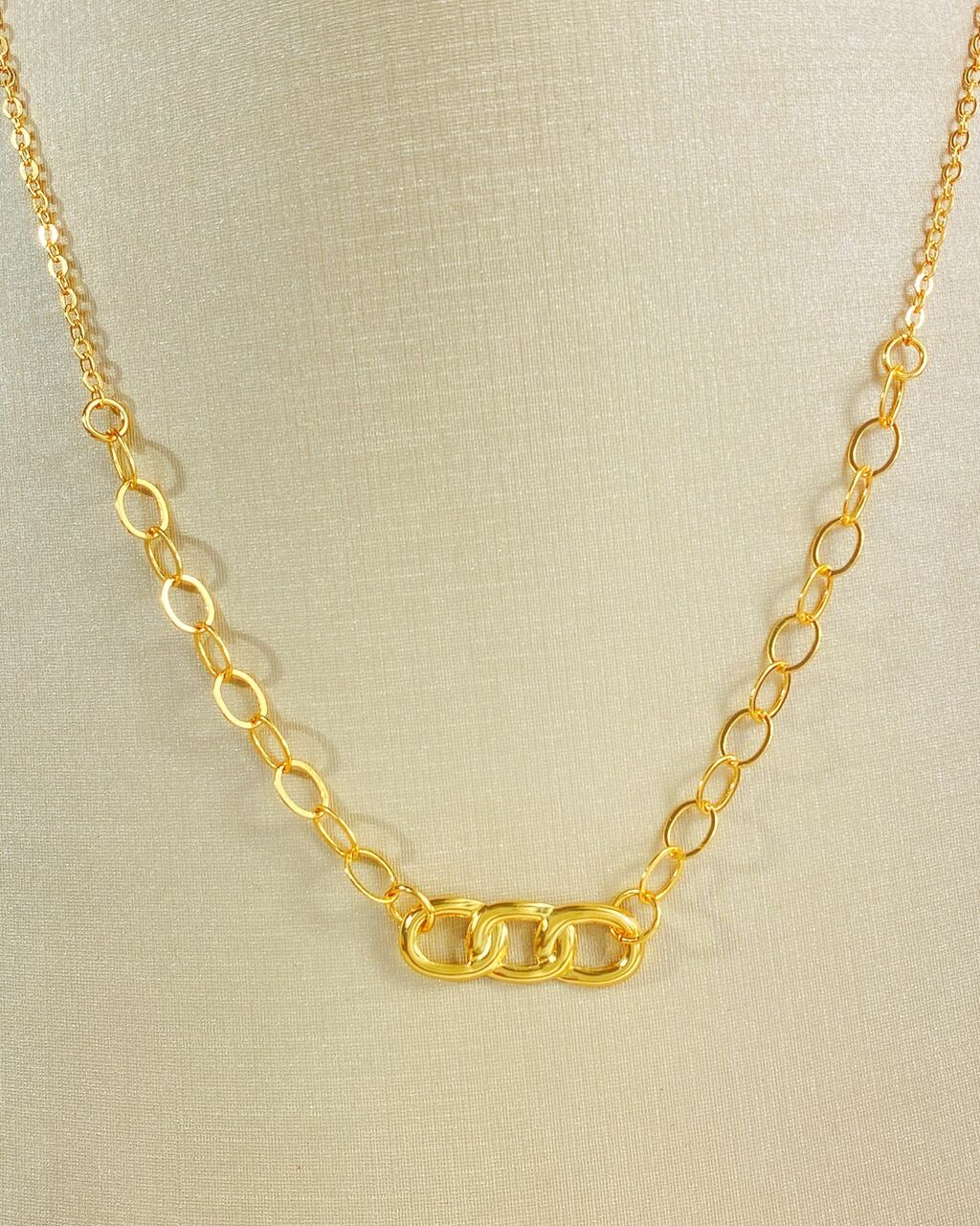 O Colar Elos é uma peça cheia de estilo e personalidade. Com 40 cm de comprimento mais 5 cm de extensor (Total: 45cm), ele oferece um ajuste perfeito ao pescoço, permitindo que você escolha o comprimento ideal. É composta por elos delicados, e no centro, tem um pingente fixo, que simula uma corrente com 3 elos, adicionando um toque moderno e sofisticado.